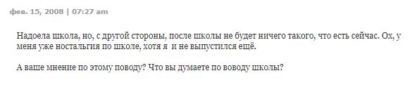 Регистрируюсь на форуме ultimatekylie.ru, виртуально присоединяюсь к фан-клубу Кайли Миноуг, откуда ворую инфу для своего клуба Kylie & Dannii на Я.ру. Исследую зарубежные блог-платформы (в частности, сайт Переза Хилтона). Возвращаюсь в аську (уже под новым номером)