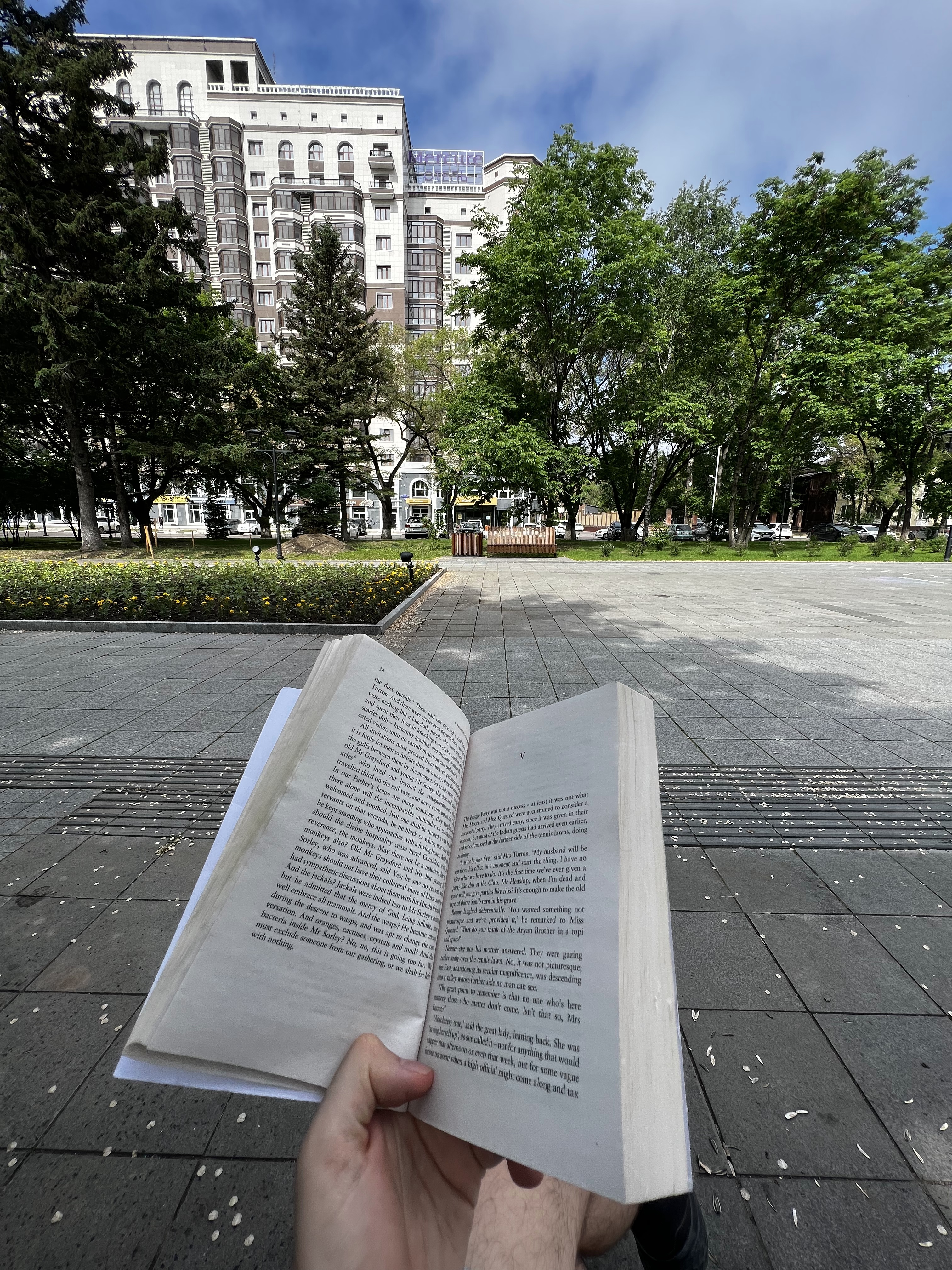 Второй завтрак состоялся в девять, и после этого я двинулся на утреннюю прогулку. Она также содержала чтение Пассажа в Индию Эдварда Форстера. И погода ещё была чудесной: слегка облачно, приятный прохладный ветерок. От утреннего тумана не осталось и следа.