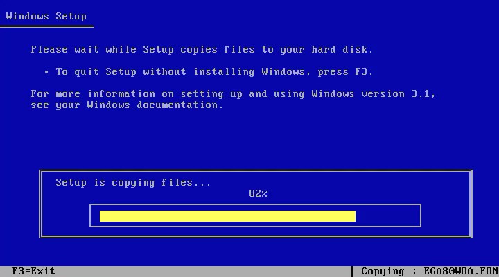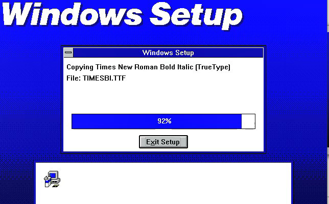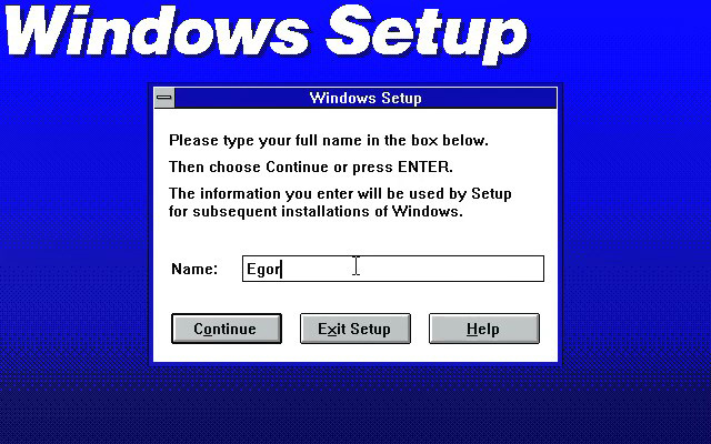 После установки я воткнул в виртуальный привод диск уже с виндой и попросил запустить: setup.exe. Оформление установщика настолько простое, что я даже не сразу уловил момент, когда подключился дизайн винды. После моих попыток с установкой Windows 95 (а там при установке меняются цветные картинки) здешний шрифт Windows Setup выглядит страшновато.