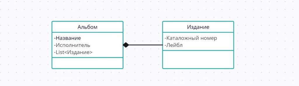 В коде такое отношение нужно отразить таким образом, чтобы Издание не могло инициализироваться вне альбома. Чтобы никто ненароком не создал Издание, не относящееся ни к какому альбому. И в объекте альбома обязательно должен быть список изданий (в других примерах это не обязательно список, достаточно поместить хотя бы одиночный объект в контейнер).