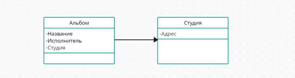 Мой пример это альбом и студия звукозаписи. В буклете обычно указывают, где записан альбом, и для некоторых слушателей это важная информация. Поэтому в класс Альбом можно поместить информацию об этом. Но Студия и сам Альбом существуют вполне независимо друг от друга.